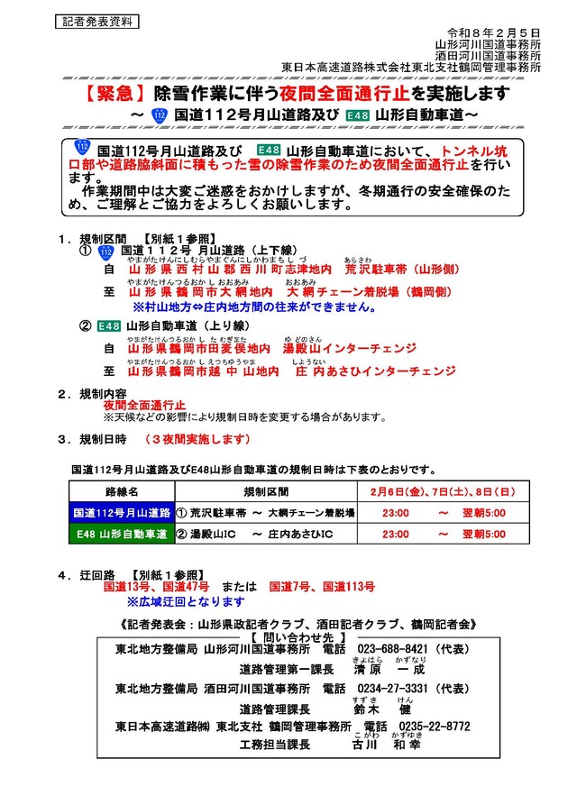 国道112号月山道路及び山形自動車道において、トンネル坑口部や道路脇斜面に積もった雪の除雪作業のため夜間全面通行止めを行うと、酒田河川国道事務所より発表がありましたのでお知らせします。