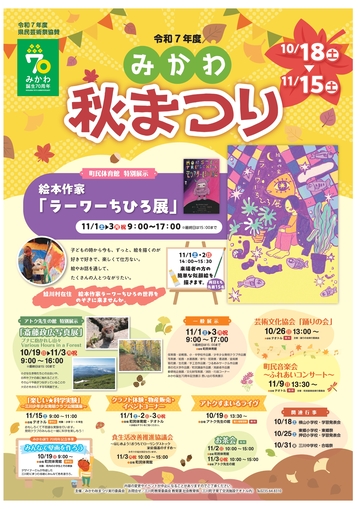 保育園・幼稚園、小・中学校作品展/少年少女発明クラブ作品展/写真展/絵画・水墨画展/俳句・短歌展/書道展/盆栽展/菊花展/生花展/手工芸作品展/つるあみサークル作品展/菜の花大学作品展/町民講座作品展//高齢者作品展/郵便局企画展/文化財写真展/消防・行政コーナー/みかわ誕生70周年記念展示 思い出の写真展示
