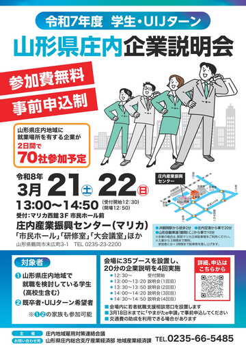 山形県庄内地域で就職を検討されている学生の方や庄内地域にUIJターンを希望する方などを対象に、庄内地域に就業場所を有する企業の就職情報に関する説明会を開催します。