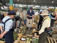 地場産(庄内)の野菜を配列したせり人が移動してせりにかける。