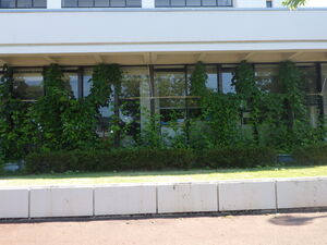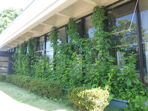 窓付近の地面や日差しを受けると、表面温度が上昇し室温も上昇します。グリーンカーテンは、地面や壁の表面温度上昇を抑え、室温の上昇も抑えられます。また、グリーンカーテンを設置するときは、できるだけ建物から離し地面や壁も広く覆い、南向きの場合は斜めに、東や西向きの場合は垂直に設置すると効果的です。